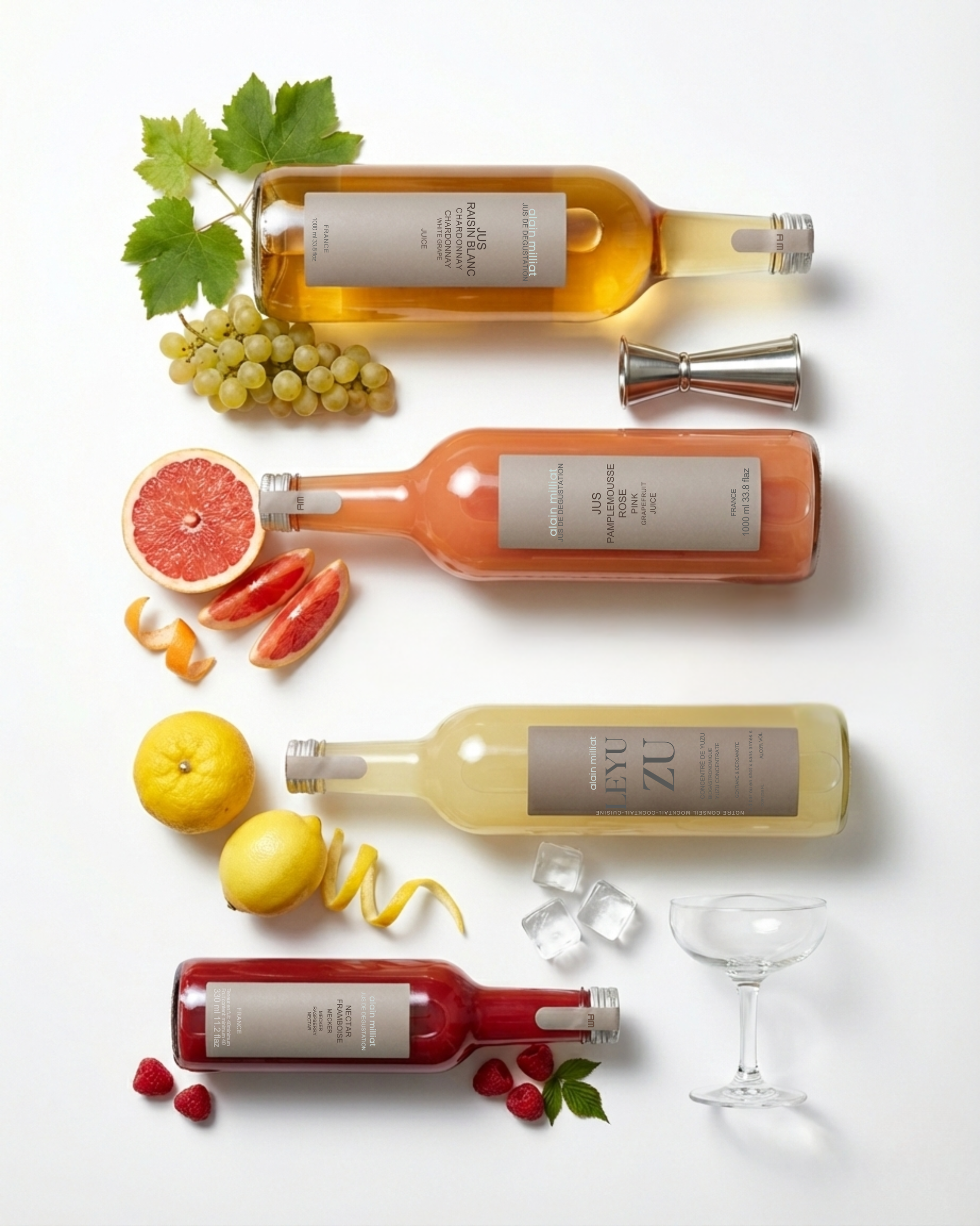 Cocktail kit- rinkinys kokteiliams ir aperityvui, kai norisi aiškaus balanso: gaivos, struktūros ir švaraus citrusų ryškumo. Alain Milliat skoniai čia sukomponuoti kaip baro bazės: Chardonnay baltųjų vynuogių sultys suteikia elegantišką, “wine-like” kūną, rožinis greipfrutas prideda sausos gaivos, yuzu koncentratas įneša ryškų citrusinį „kick“, o aviečių nektaras suapvalina ir duoda minkštą vaisinį finišą.